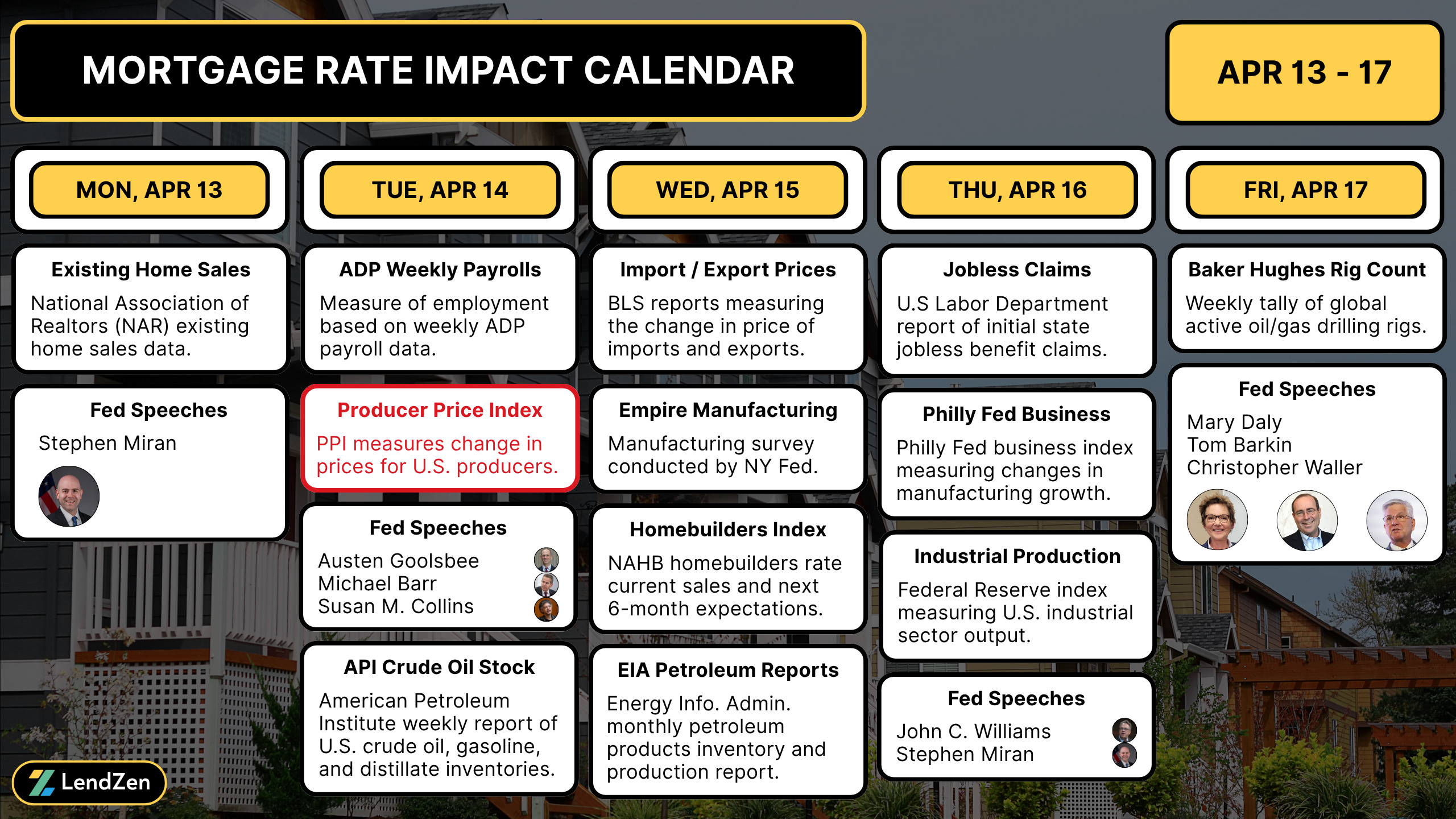 The ceasefire in Iran has helped mortgage rates claw back roughly half of the March losses, but the week is packed with housing data, manufacturing surveys, and multiple Fed speakers that could reintroduce.
