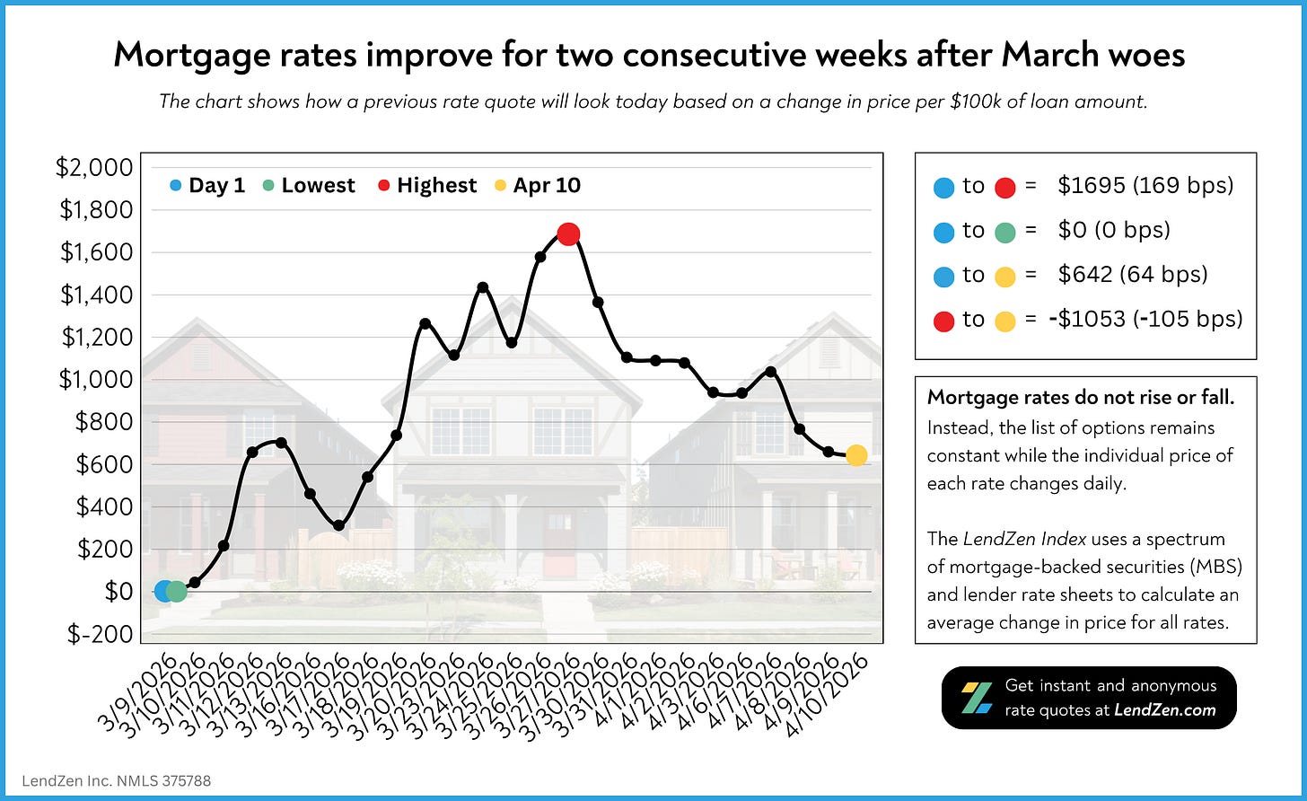 Mortgage rates, in response to the Iran ceasefire, have clawed back more than half of the March losses since the new month began.