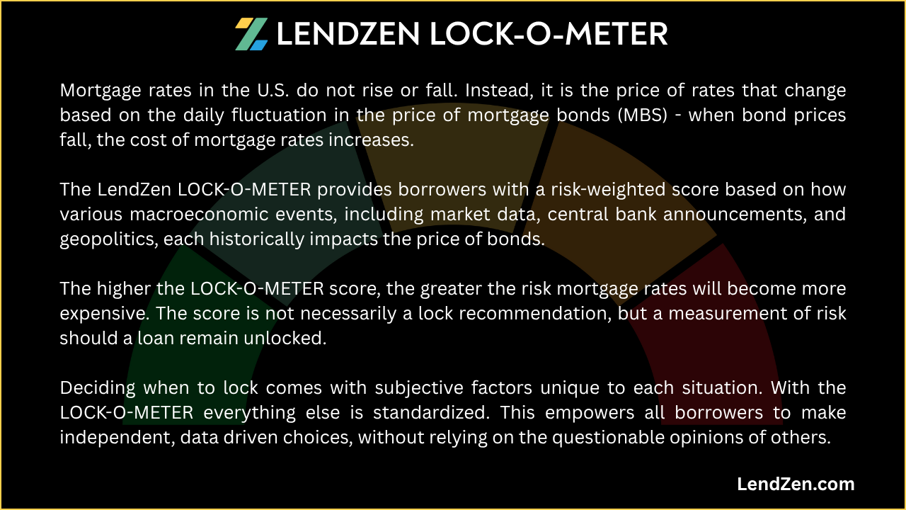 The LendZen LOCK-O-METER provides borrowers with a risk-weighted score based on how various macroeconomic events, including market data, central bank announcements, and geopolitics, each historically impacts the price of bonds.