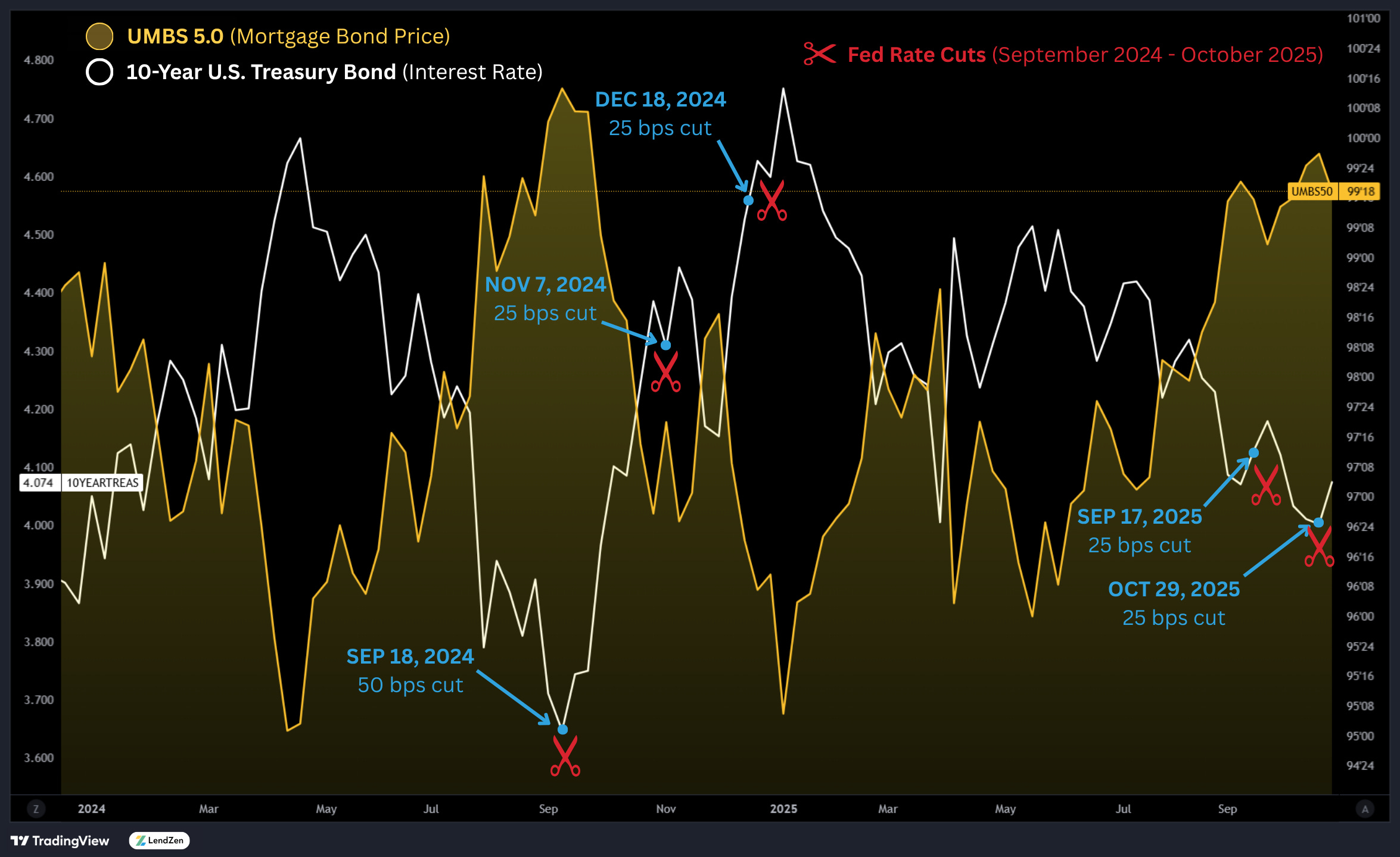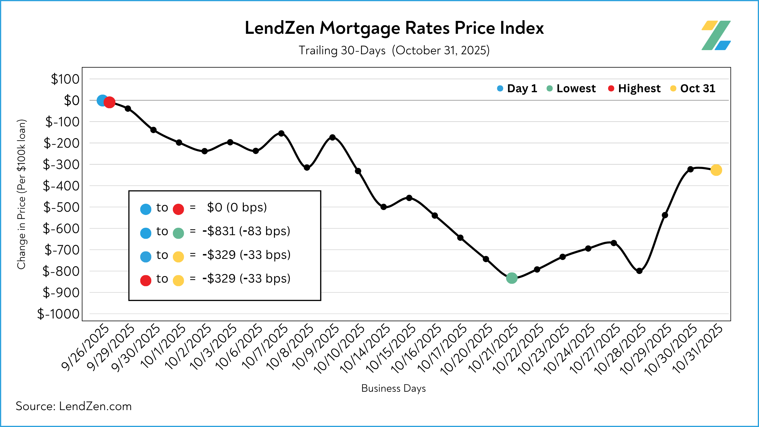 The LendZen Index calculates a daily change in the price of mortgage rates by tracking a spectrum of mortgage-backed securities (MBS).
