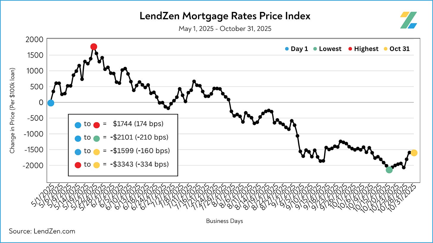 The LendZen Index monitors the change in price across a broad set of rates and mortgage bond coupons, whereas the LendZen Mortgage Rate Price Tracker is more “rate and loan program” specific.