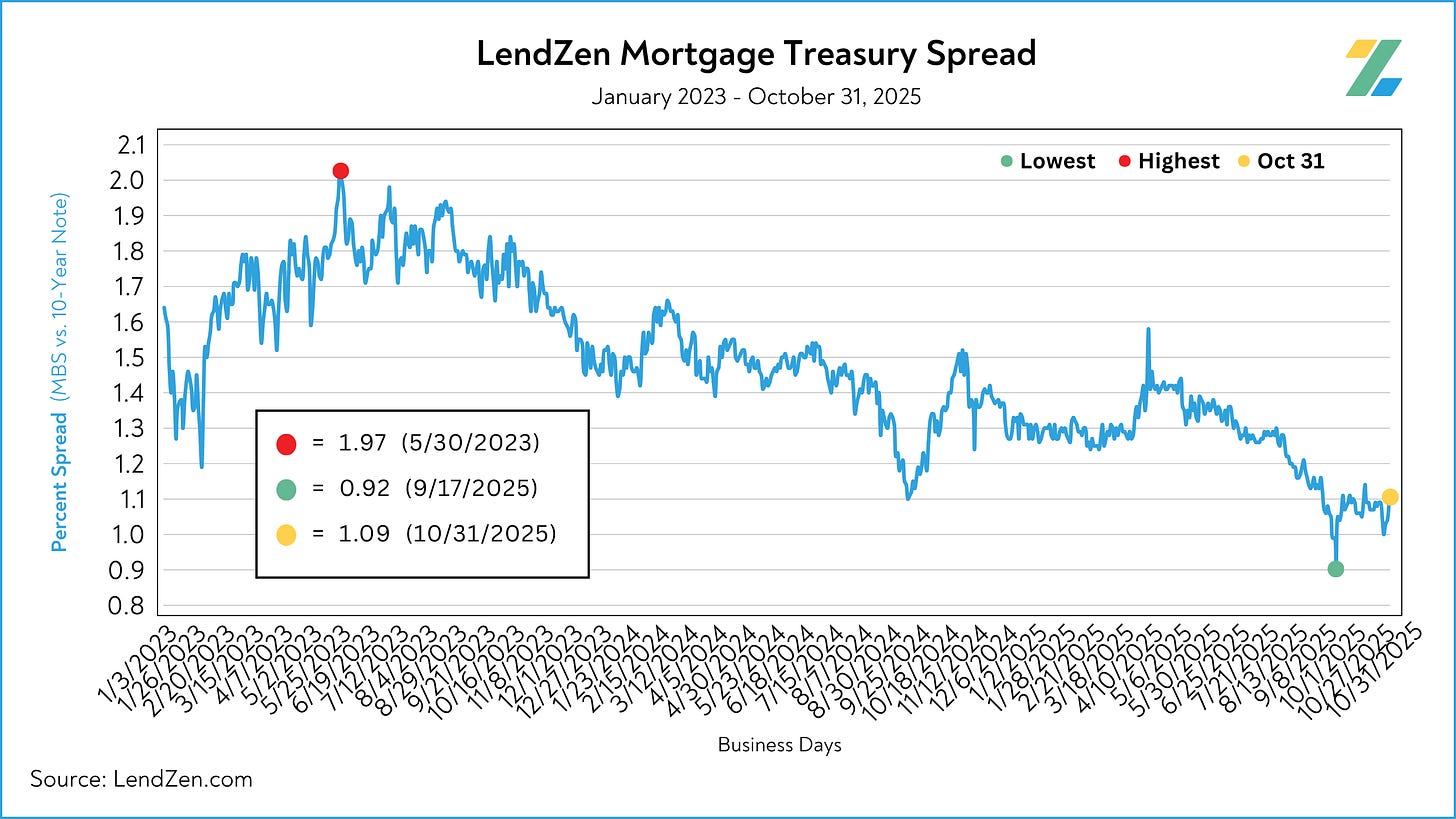 The spread between mortgage bonds and the U.S. 10-Year widened 4-bps during the week, after flirting with a sub-1% spread before the Fed rate cut decision.