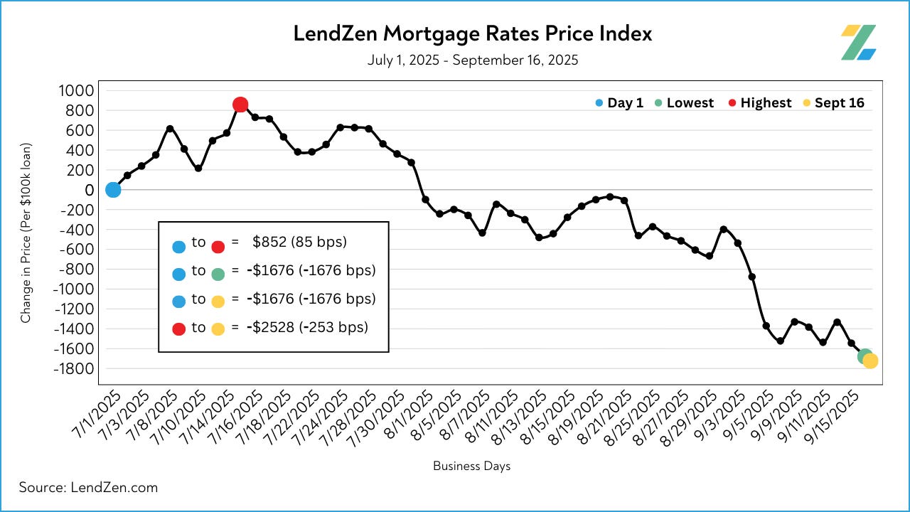 At one point mortgage rate prices declined over 250 basis points from the July 15 high but have given up about 35 bps of that since the Fed rate cut.