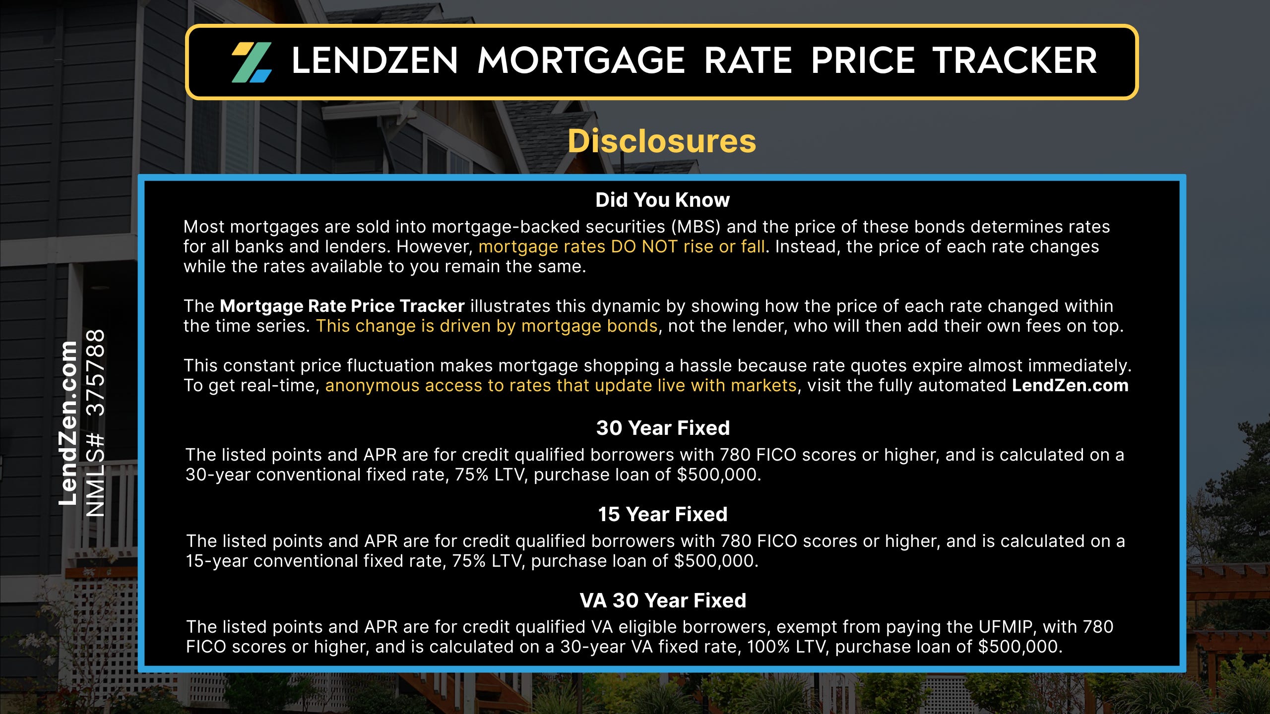 LendZen provides a fully automated mortgage shopping experience that gives you anonymous access to all mortgage rates with full transparency of costs upfront as bond prices change.