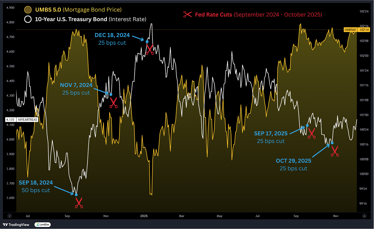 However, the last 5 rate cuts have all resulted in a bond sell-off (higher mortgage rate prices).