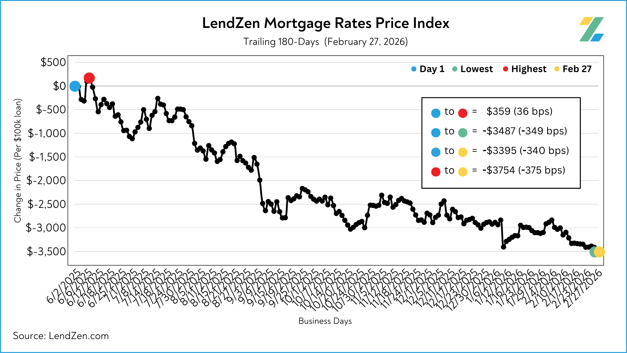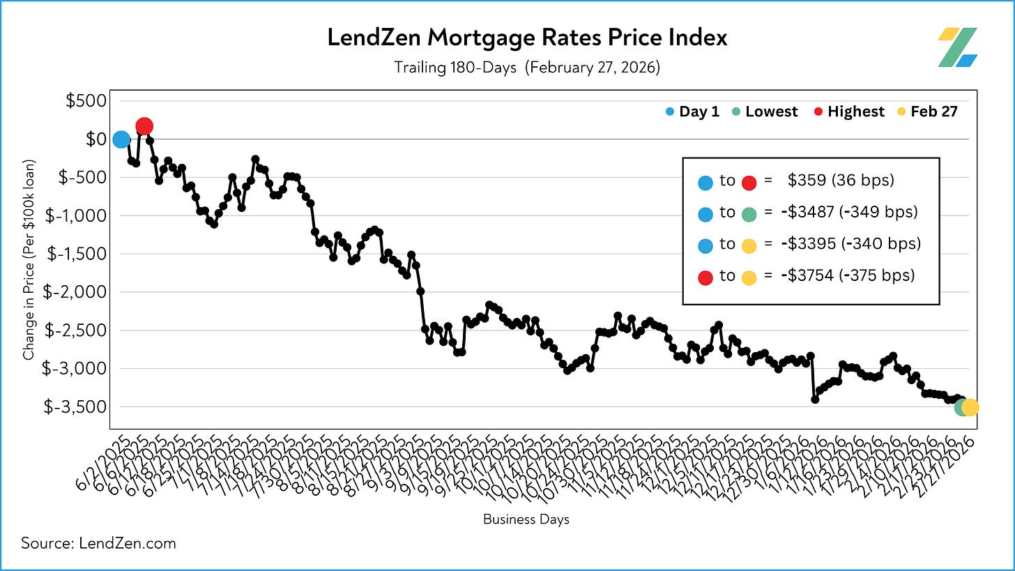 Meanwhile, the broader set of rates used in the LendZen Index show over 340 basis points of price improvement in the last 180 trading days.