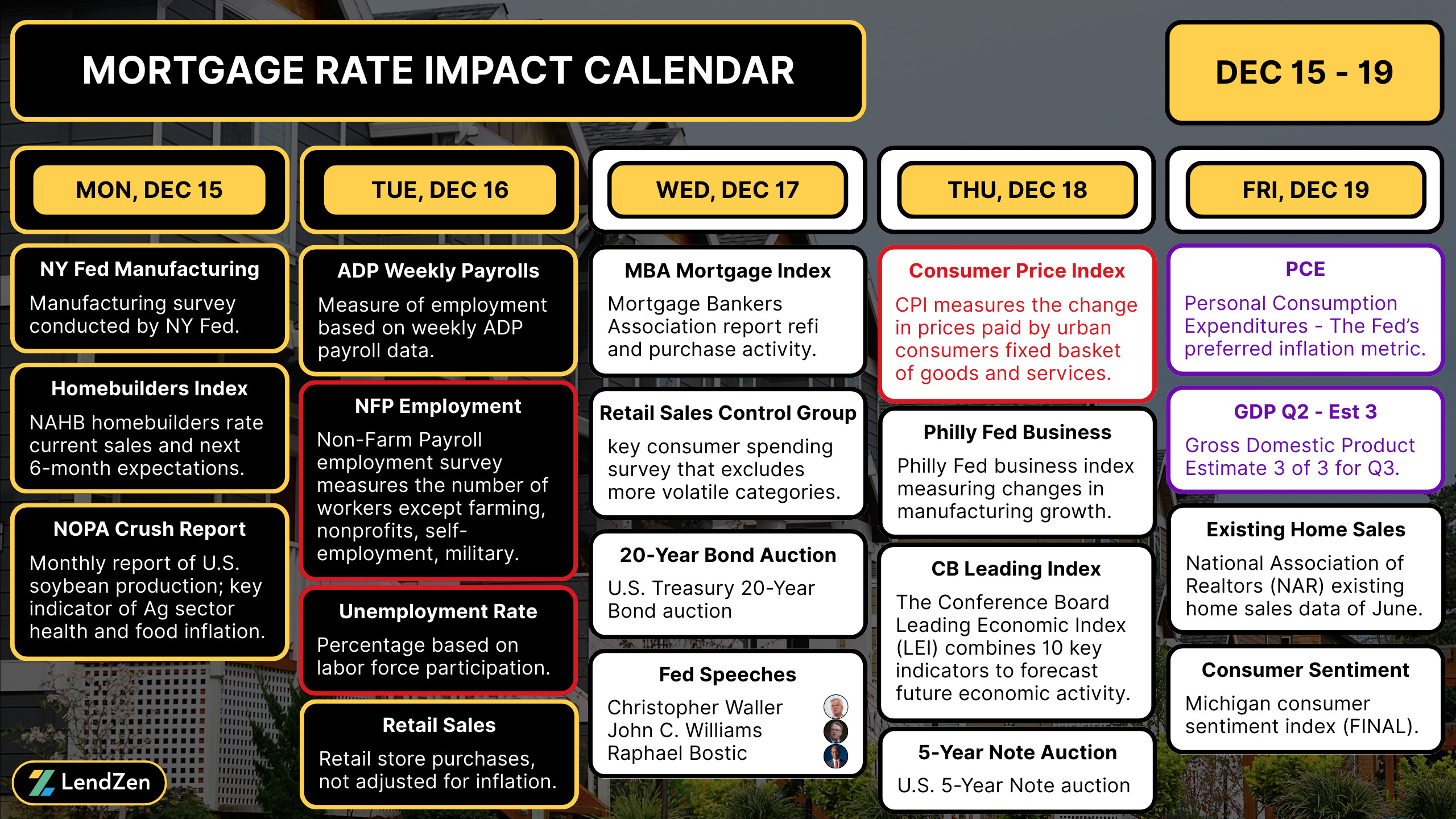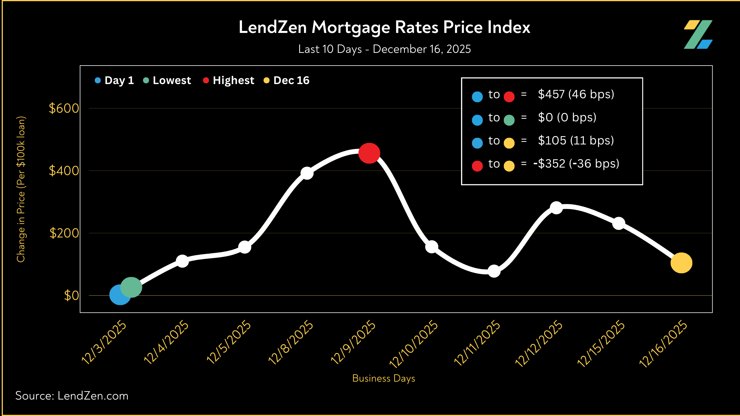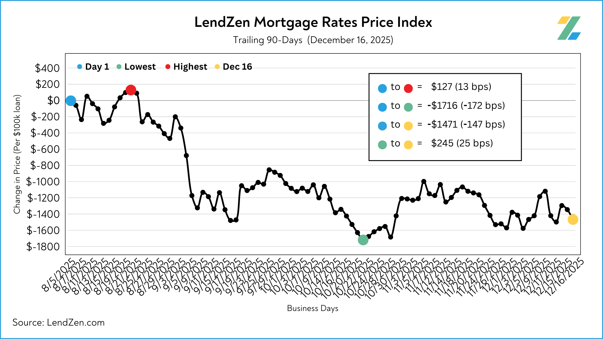 The LendZen Index calculates a daily change in the price of mortgage rates by tracking a spectrum of mortgage-backed securities (MBS).