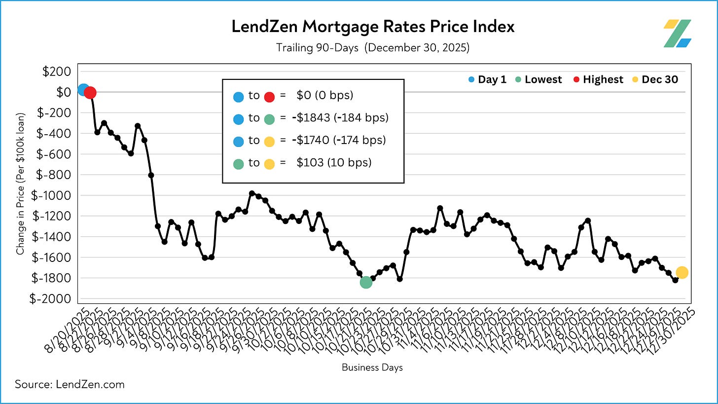Mortgage rate prices are within 10 bps of the October 21 multi-year low and down 174 bps the last 90 days.