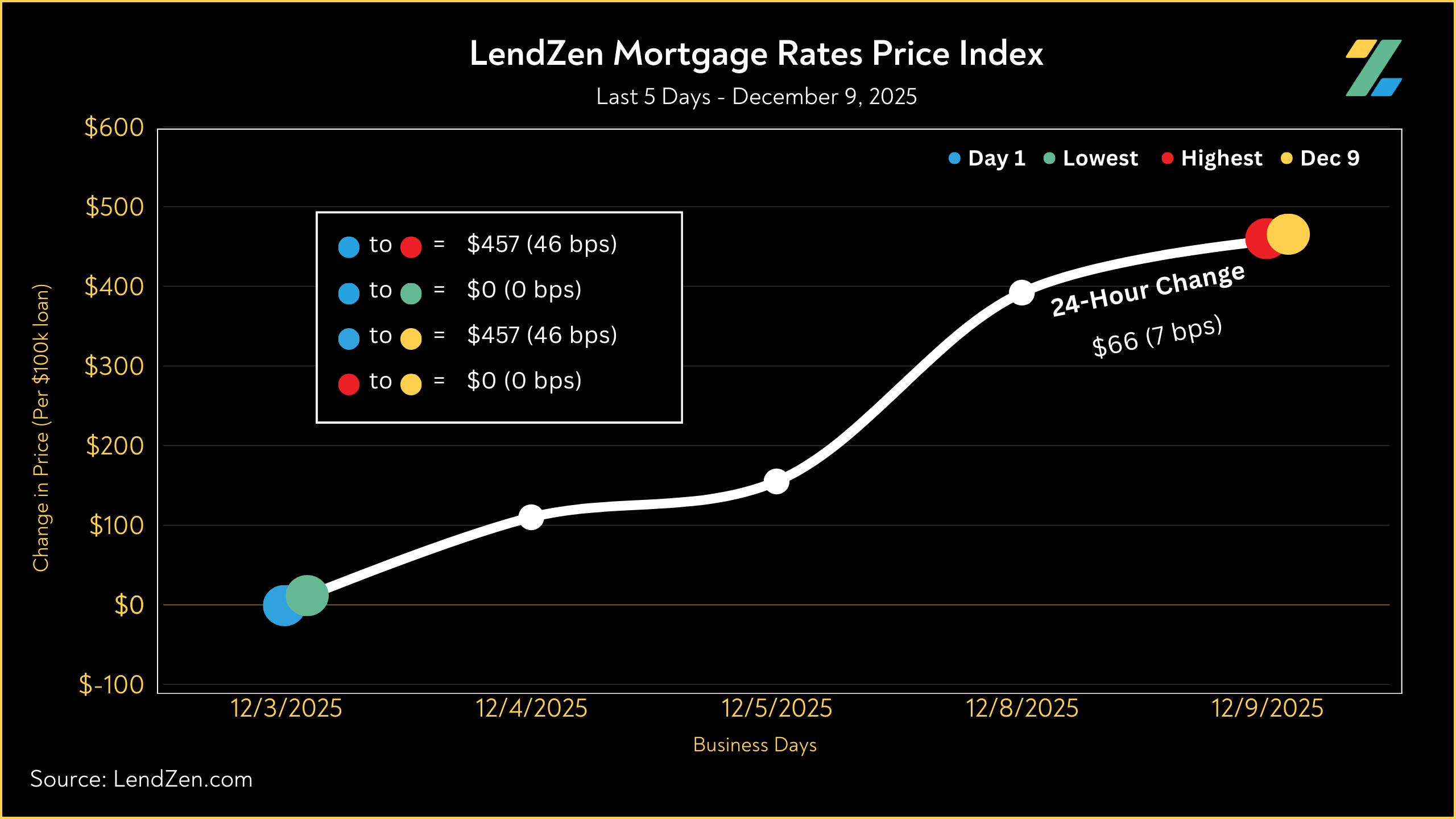 The LendZen Index calculates a daily change in the price of mortgage rates by tracking a spectrum of mortgage-backed securities (MBS).