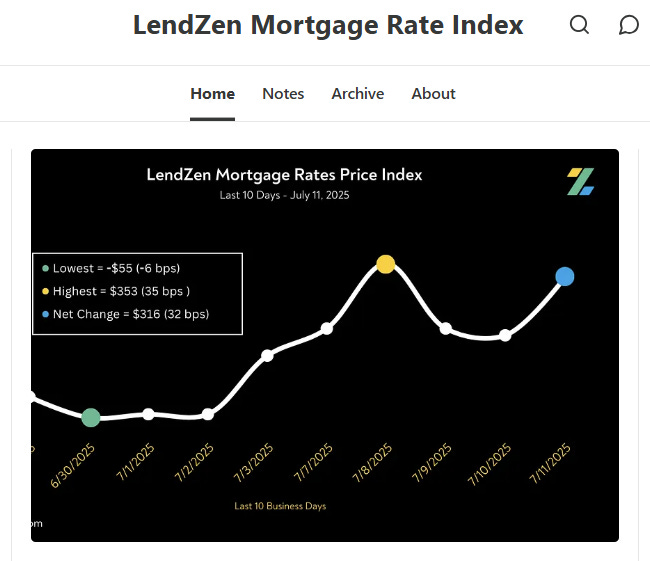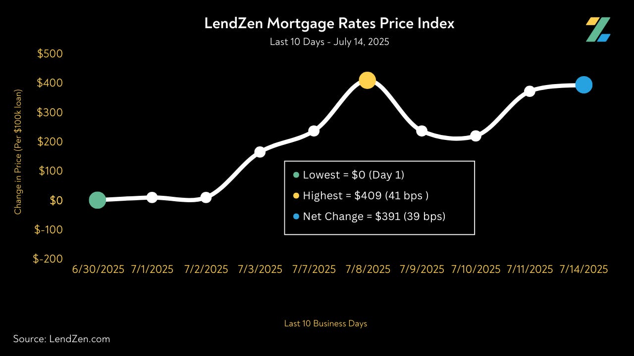 However, July has seen the price of mortgage rates slowly grind higher as shown in the 10-Day Chart of the LendZen Index below.
