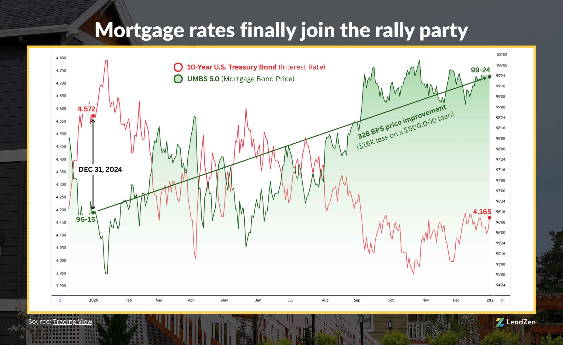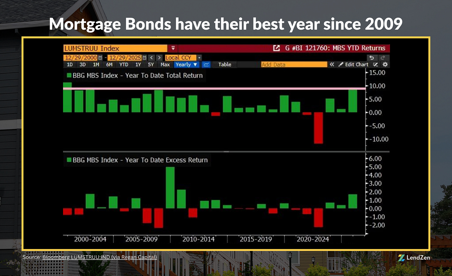 Although precious metals stole the show this year with triple-digit returns, mortgage rates had their best performance since 2020 as MBS delivered total returns not seen since 2009.
