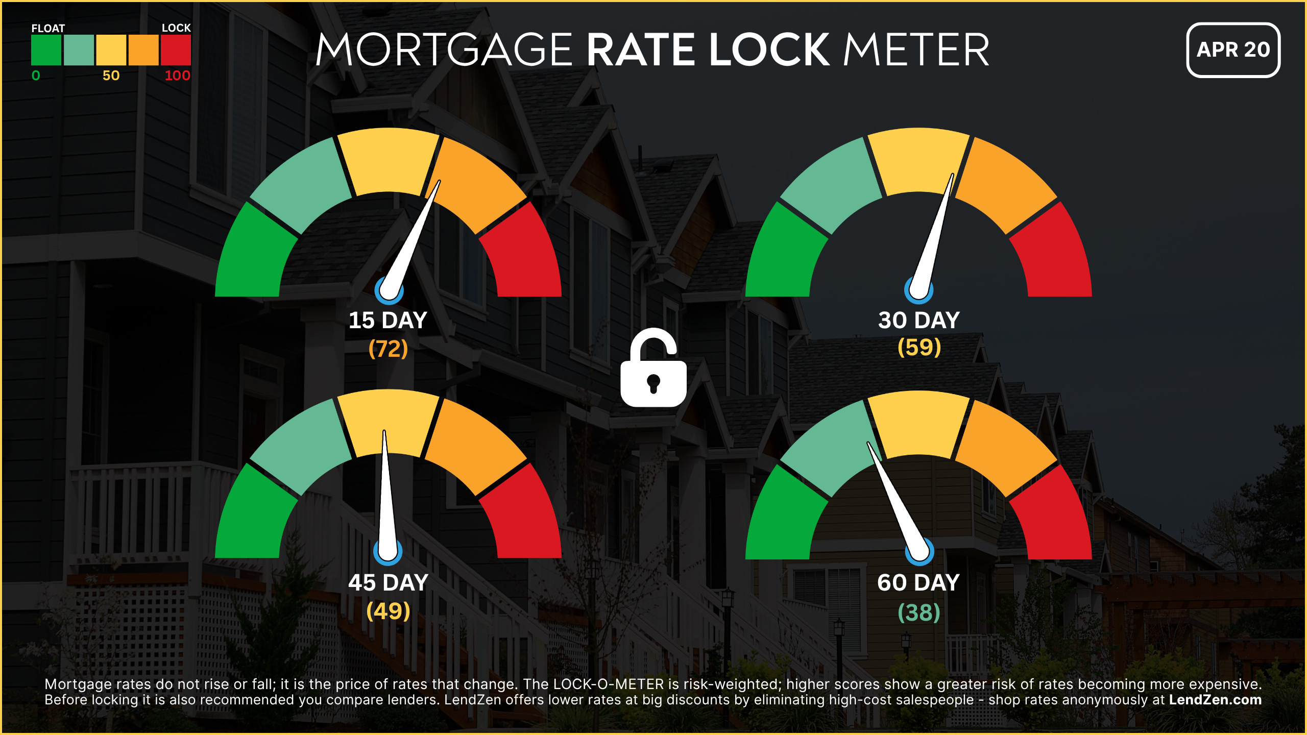 The LendZen LOCK-O-METER provides borrowers with a risk-weighted score based on how various macroeconomic events, including market data, central bank announcements, and geopolitics, each historically impacts the price of bonds.