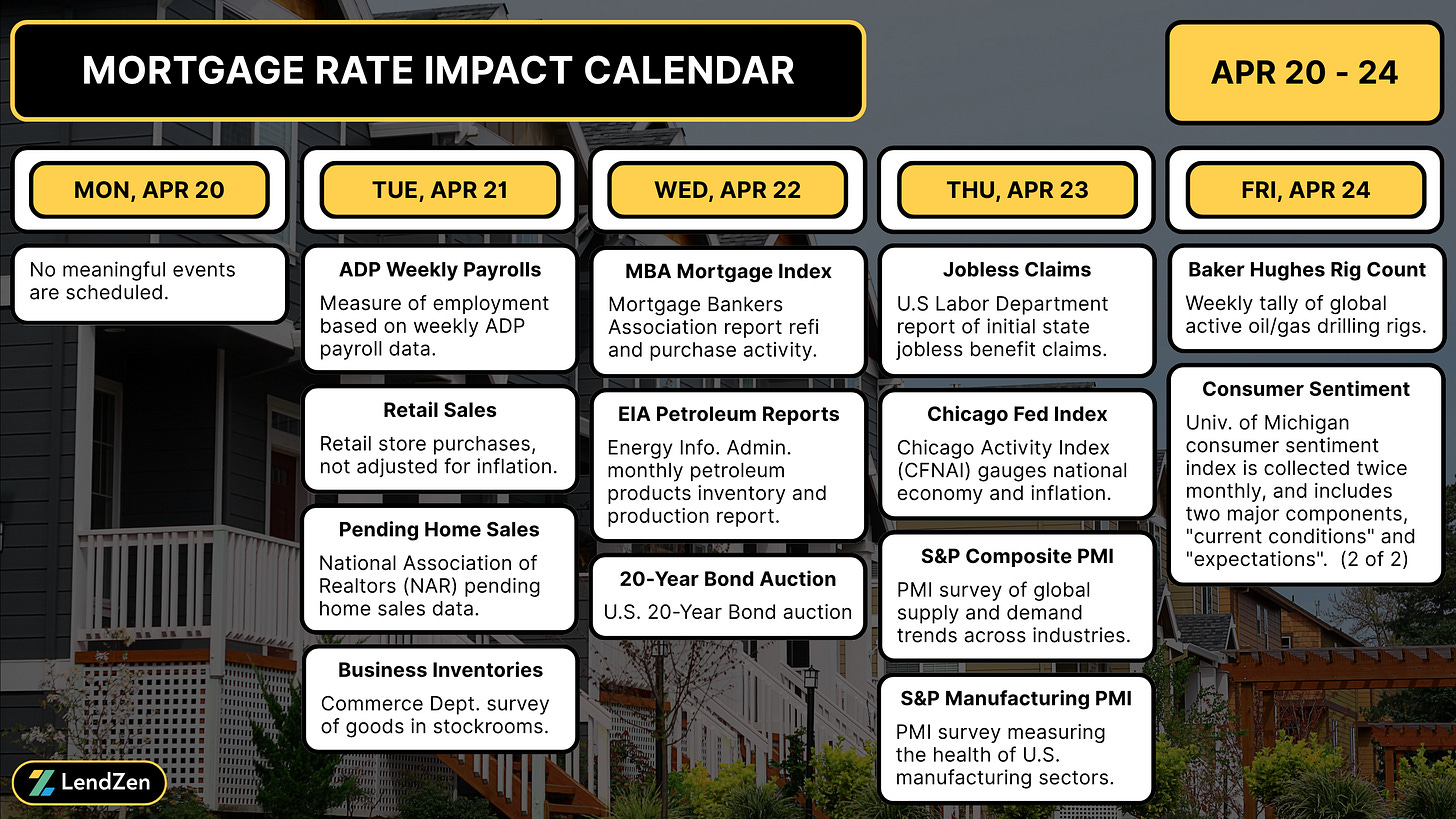 Mortgage rates have continued to improve over the past three weeks as the Iran ceasefire reduced immediate oil-price pressure, but a quiet calendar this week means any new headlines could quickly reverse recent gains.