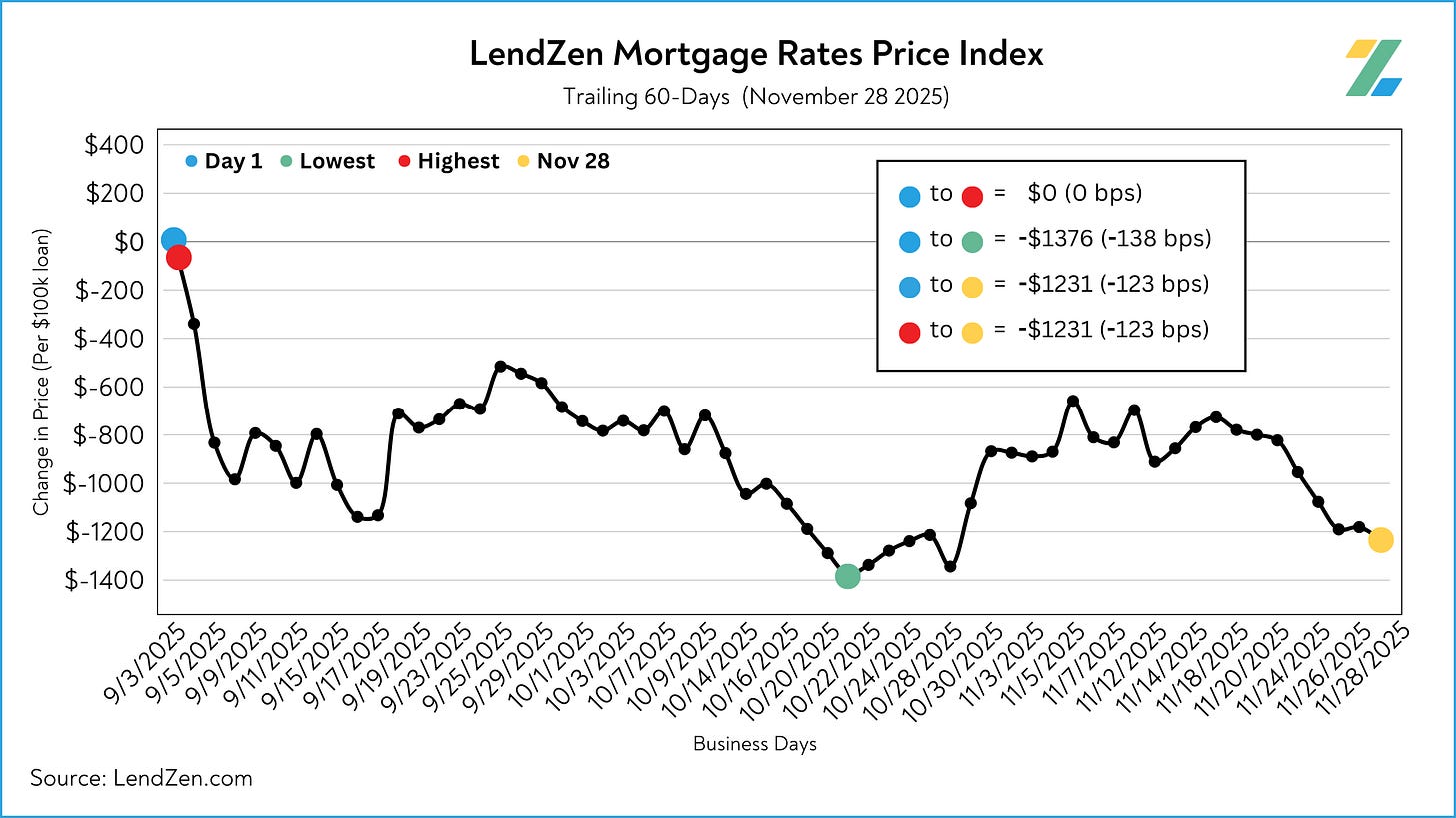After rising sharply following the Fed’s October 28 rate cut, and peaking 69 basis points above the October low, mortgage rate prices remained in a sideways pattern earlier in November but slowly recovered most of the losses in the final two weeks.
