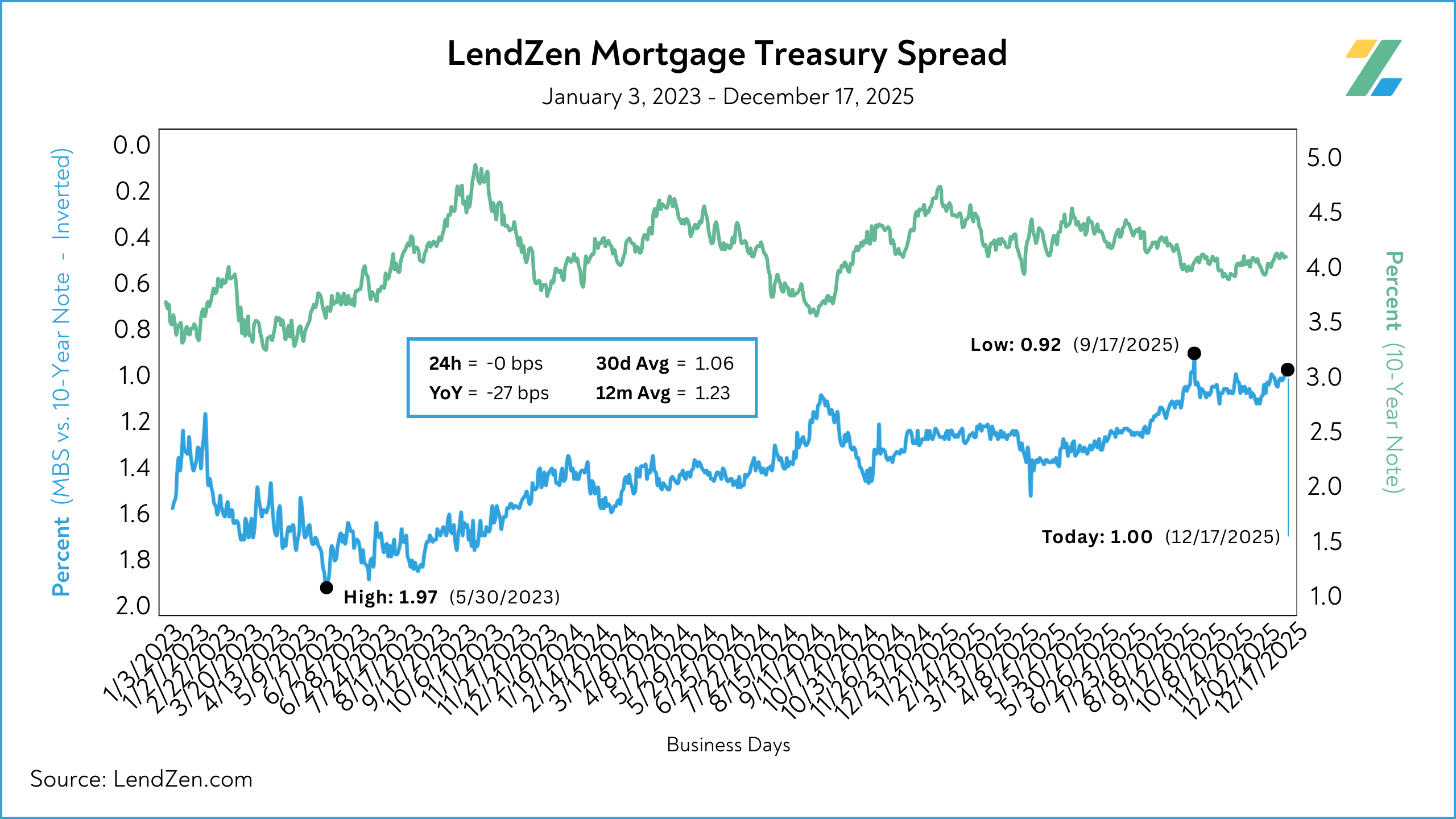 Published daily with the LendZen Index is the LendZen Mortgage-Treasury Spread.
