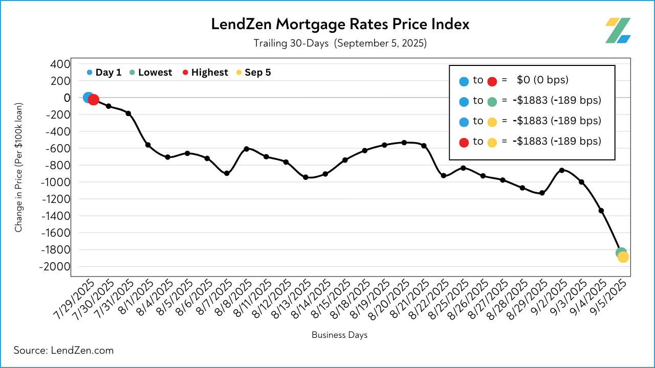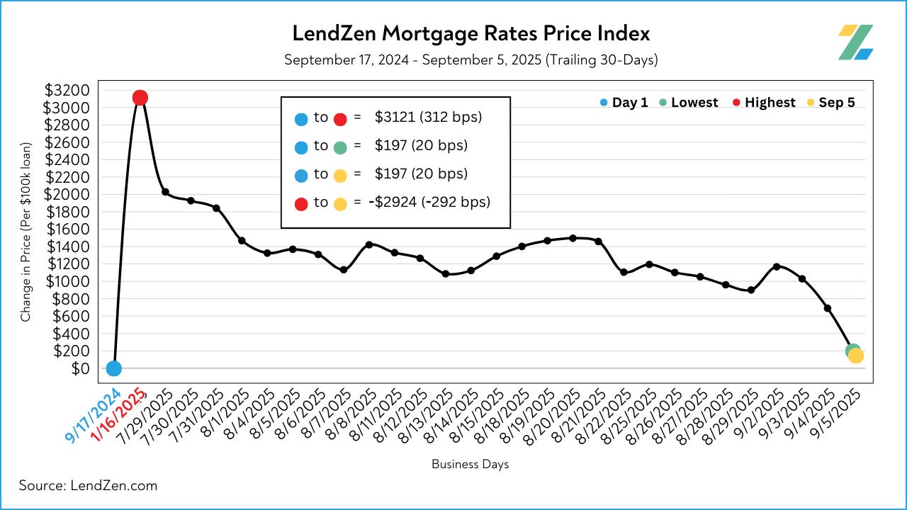 Meanwhile, the PRICE of the actual mortgage rates has fallen by over 300 basis points since the high in January, most of the improvement transpired in August.