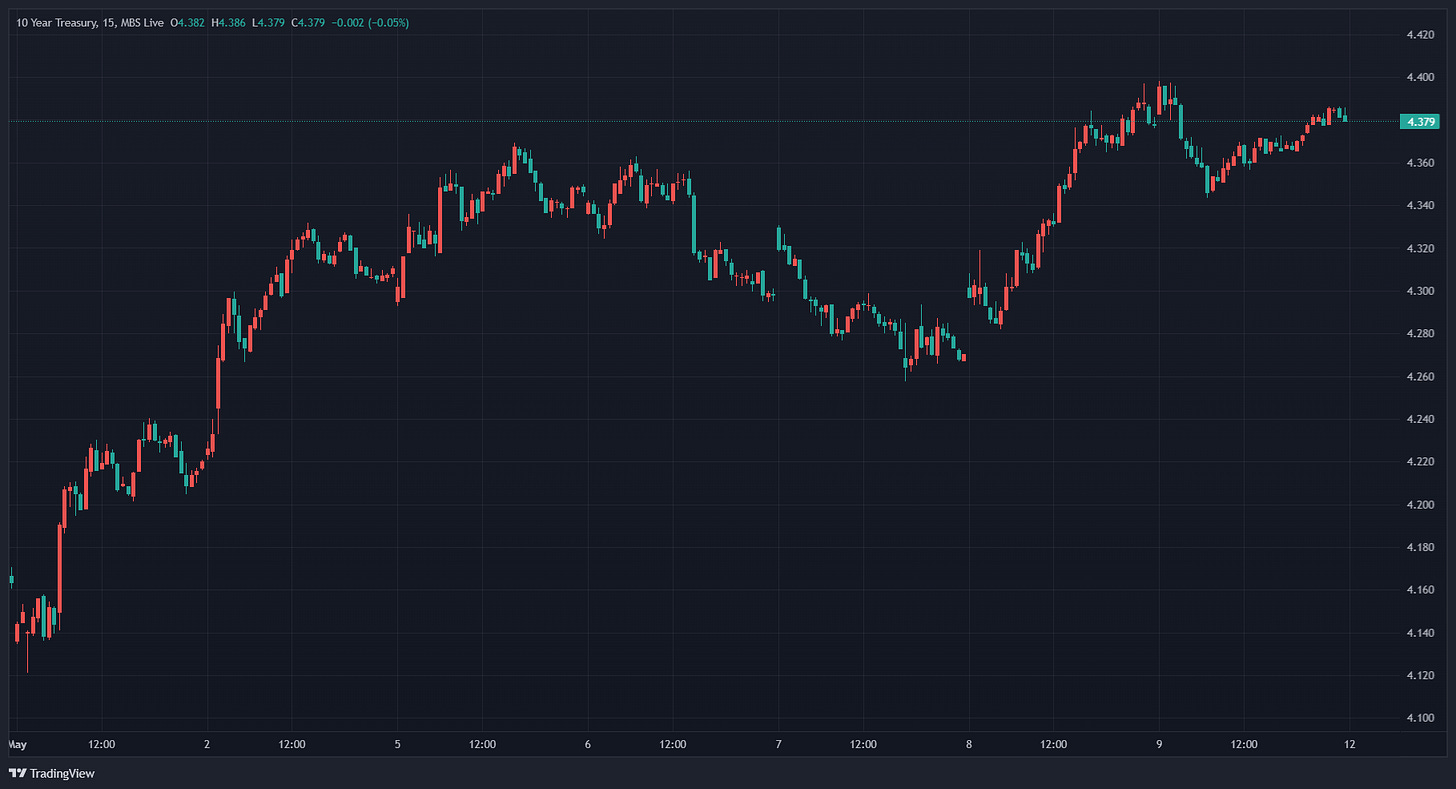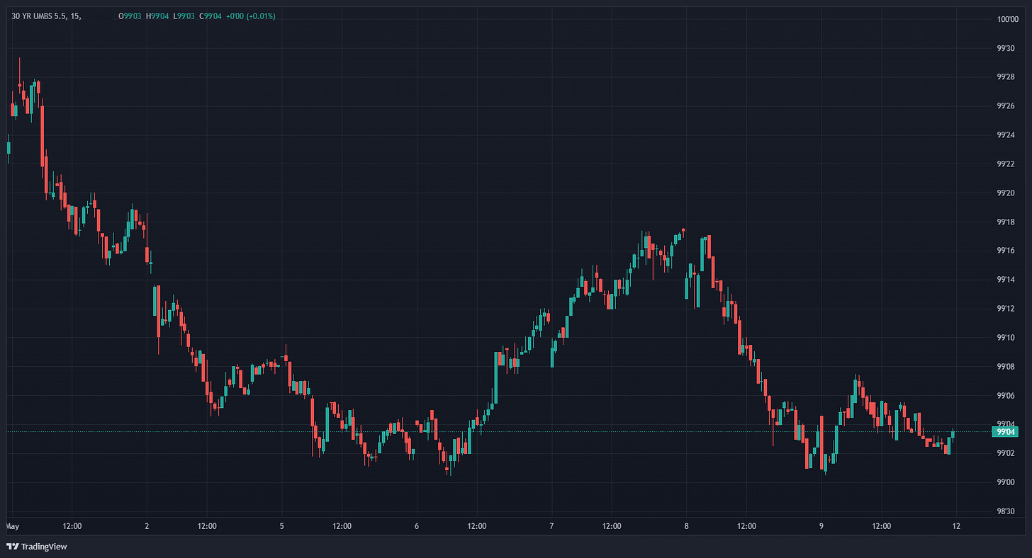 Above is a 5-day chart of the 10-Year Treasury Bond, which is considered the "risk free" rate and acts as a barometer for how mortgage bonds trade.
