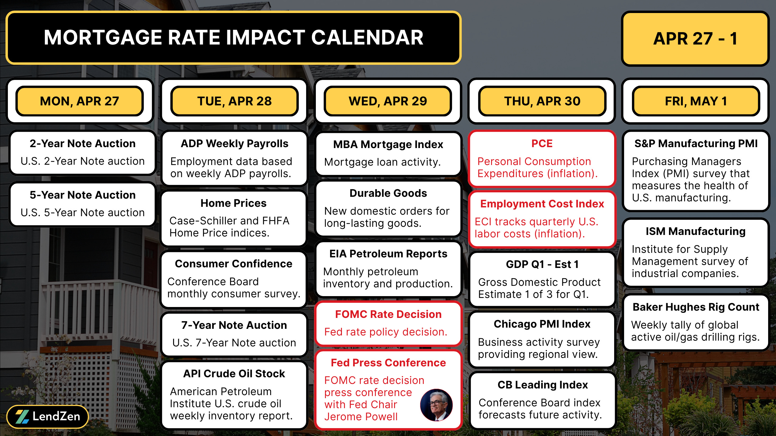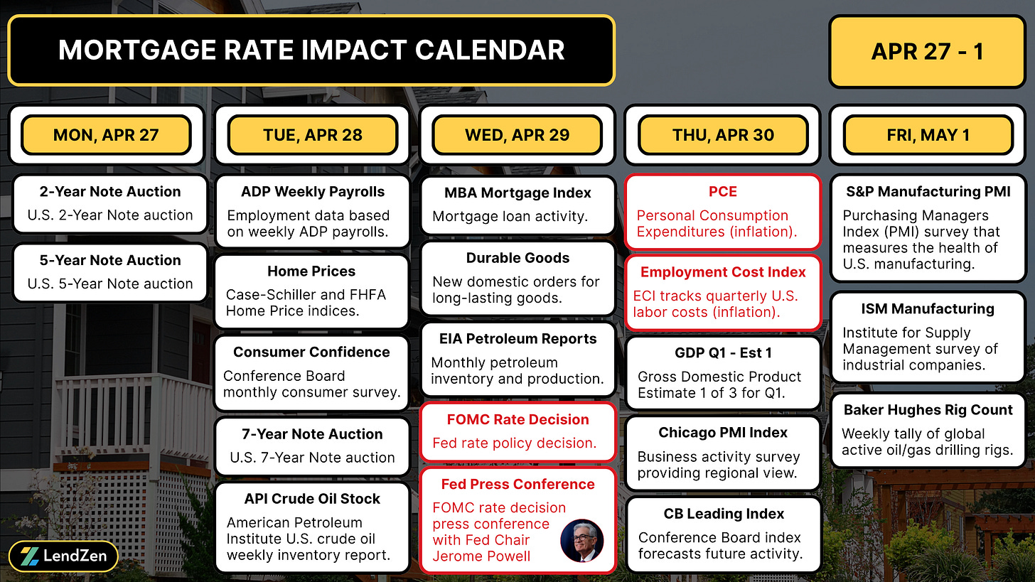 This week’s Mortgage Rate Impact Calendar is also packed with inflation focused reports (PCE, Employment Cost Index) and numerous manufacturing surveys (Chicago PMI, S&P PMI, ISM).