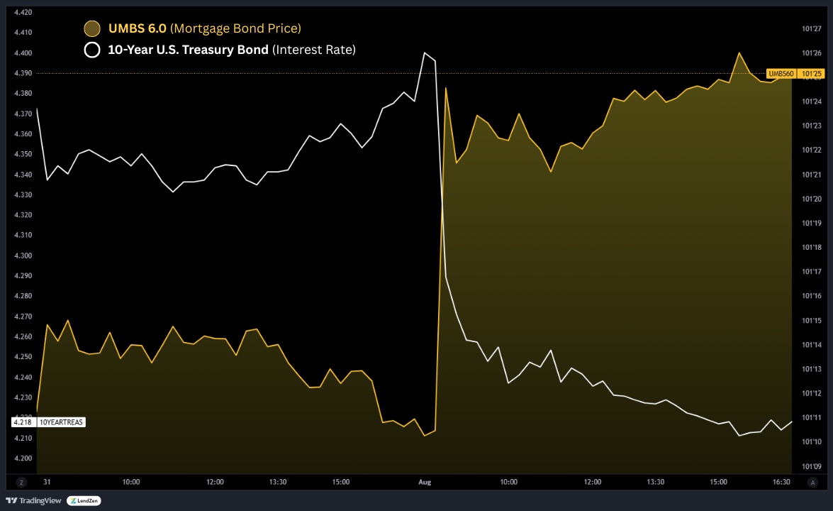 The sharp move higher in the yellow line below is the price of a mortgage-backed security increasing after the jobs data on Friday.