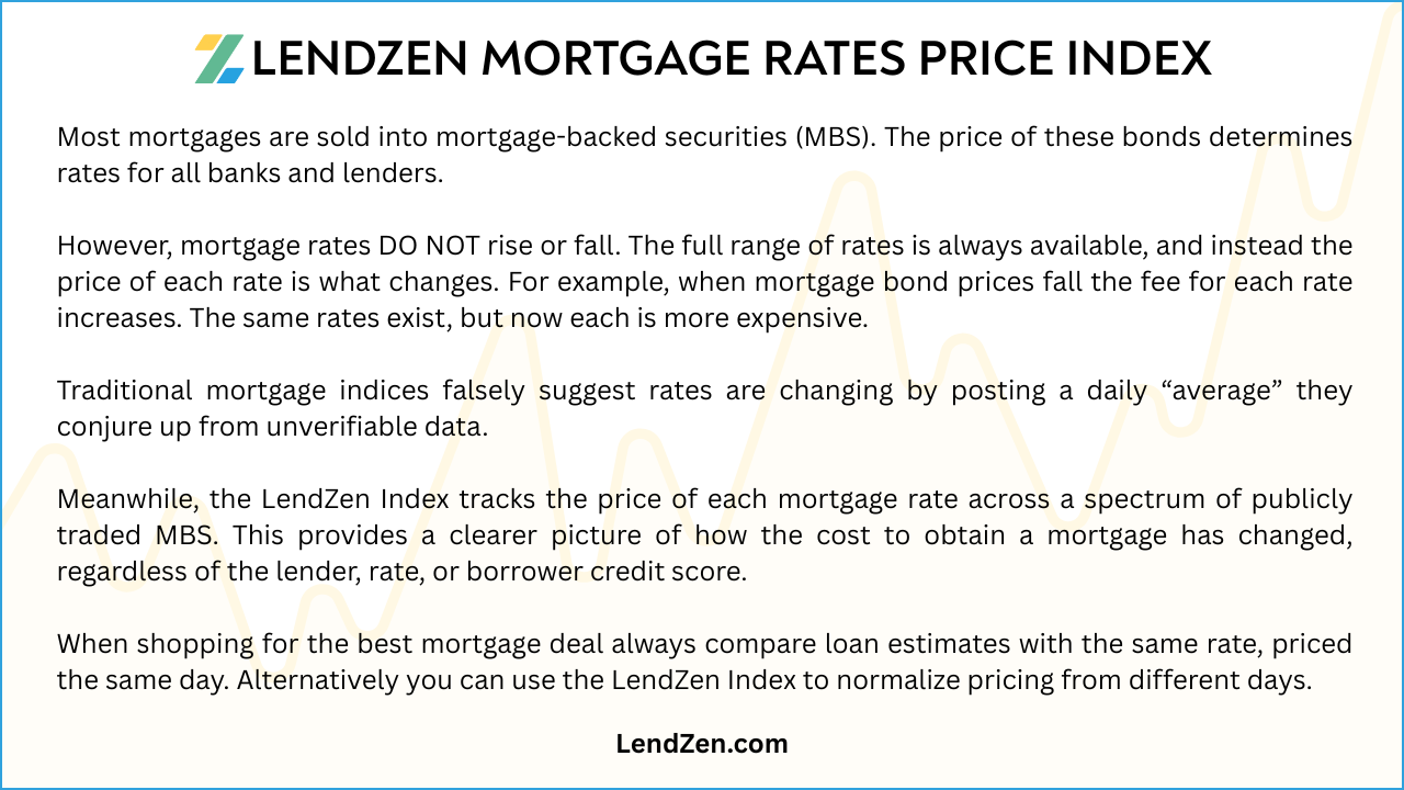 The LendZen Index was created to show you the daily change in mortgage rate prices, across a full spectrum of mortgage-backed securities (bonds).