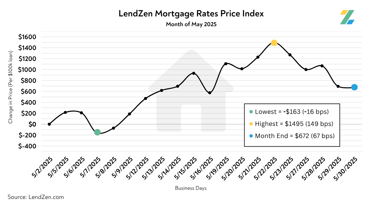 This means for a $500,000 loan, regardless of what rate a borrower was quoted on May 1, the cost to get that mortgage increased $3,350 (500000 x 0.0067) by the end of the month.